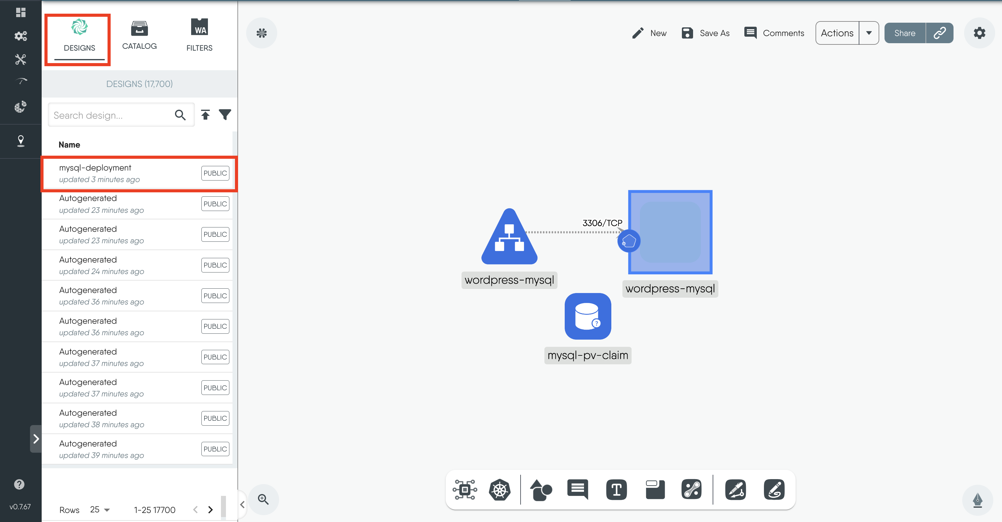 Clicking on the names of the designs on the Designs tab displays the visual representations of the various Kubernetes resources and their relationships on the canvas.