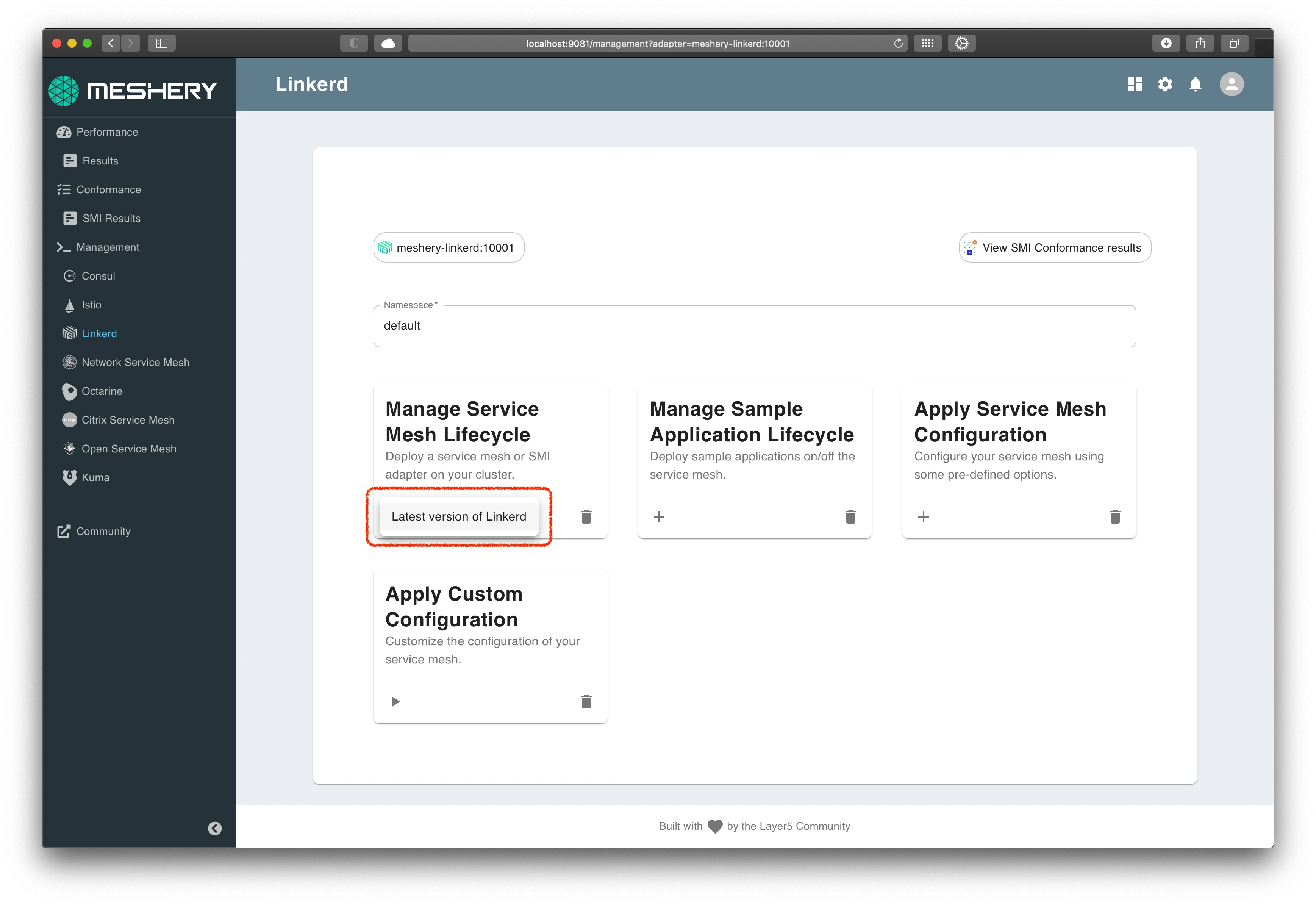 Using Meshery, select Linkerd from the Management menu.